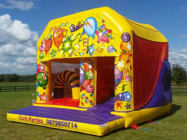 A semi-enclosed bounce house rental with attached slide. Ideal for narrower gardens in Youghal and North Cork. A popular choice for parents searching for a safe and affordable bouncy castle hire option.
