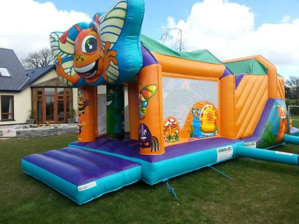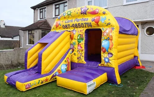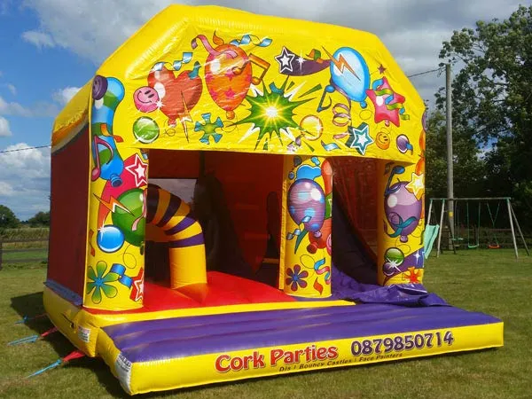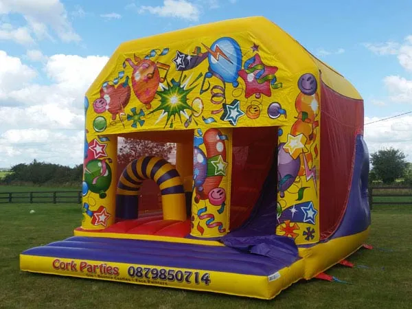 A semi-enclosed bounce house rental with attached slide. Ideal for narrower gardens in Youghal and North Cork. A popular choice for parents searching for a safe and affordable bouncy castle hire option.